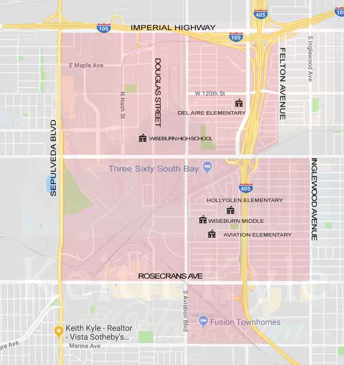 As the Wiseburn district is hightly sought after the district has boundary requirements for local residents. The district boundaries are roughly Sepulveda Boulevard on the west, Marine Avenue on the south, Imperial Highway on the north, and Inglewood Avenue on the east. **Please note that we are providing the following for information only and cannot guarantee eligibility to the district. Please consult with the district offices to determine residency restrictions and elegibility for the district.